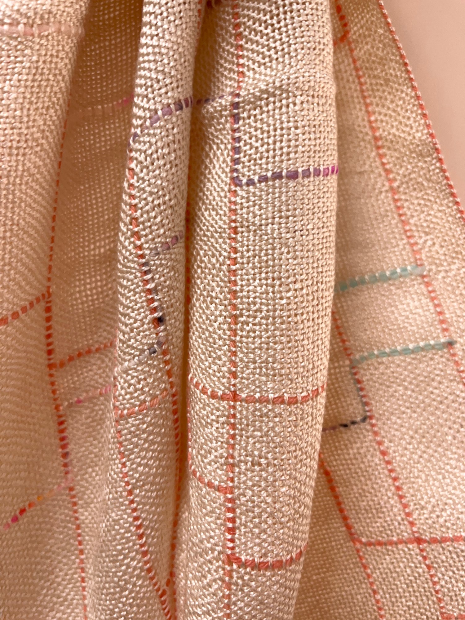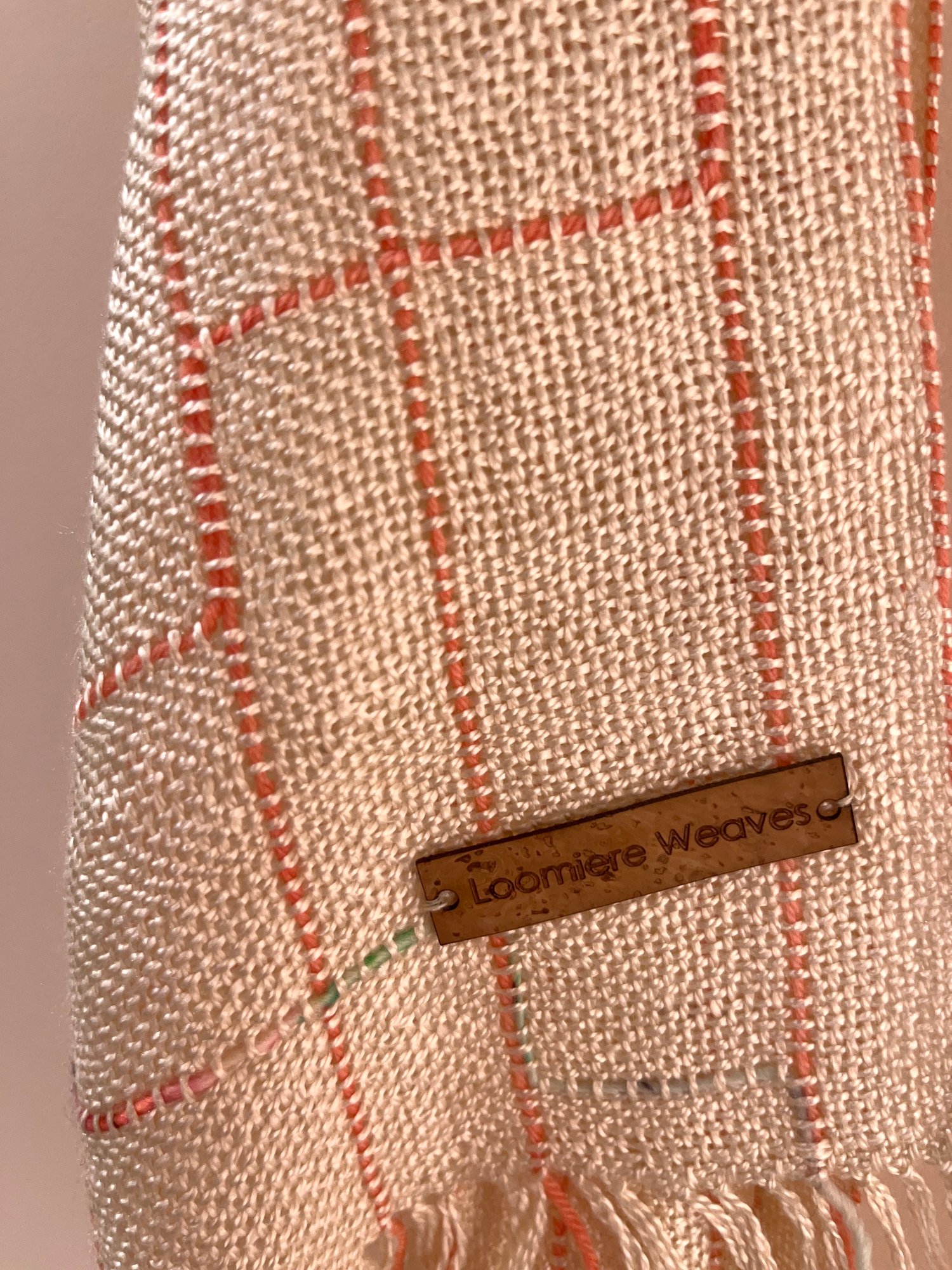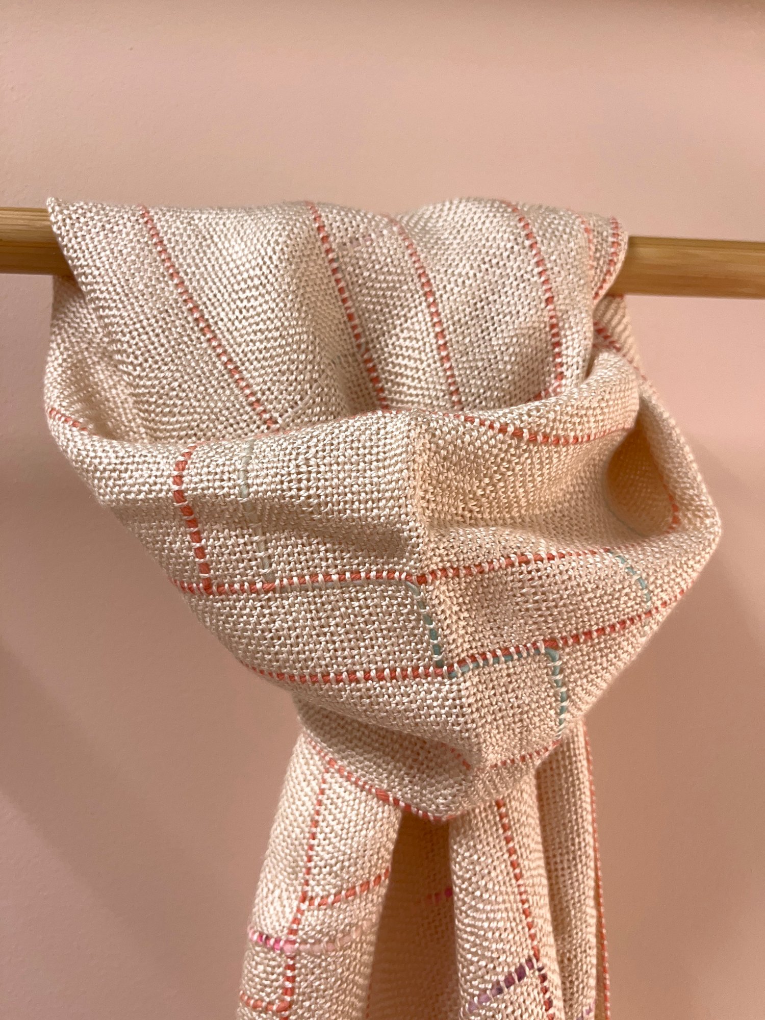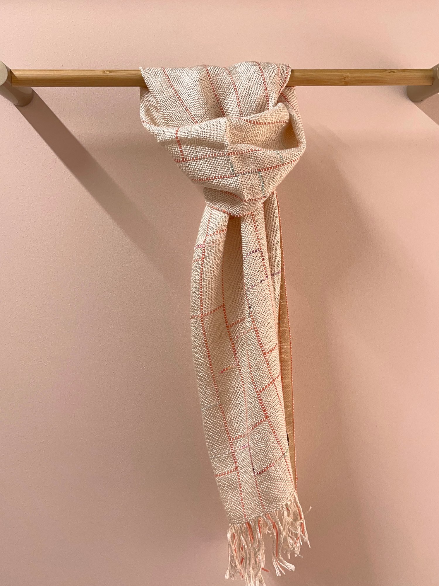 Linear Scarf in ecru silk/seaweed (seacell) yarn with coral and fleck merino wool detail.