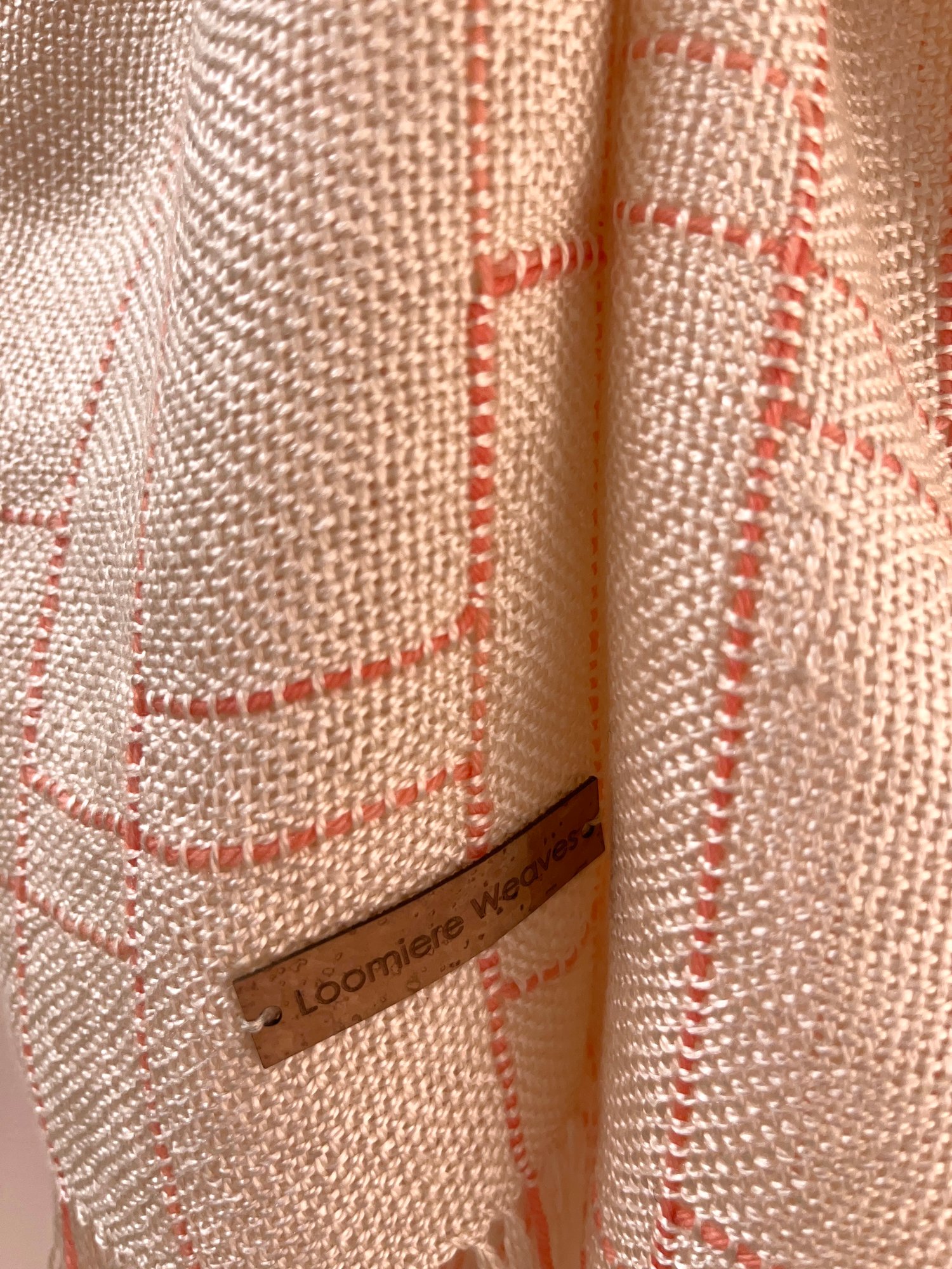 Linear Scarf in ecru silk/seaweed (seacell) yarn with coral merino wool detail.