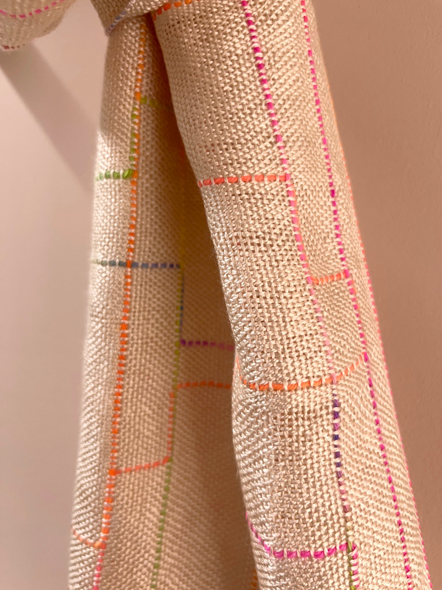 Linear Scarf in ecru silk/seaweed (seacell) yarn with rainbow merino wool detail.
