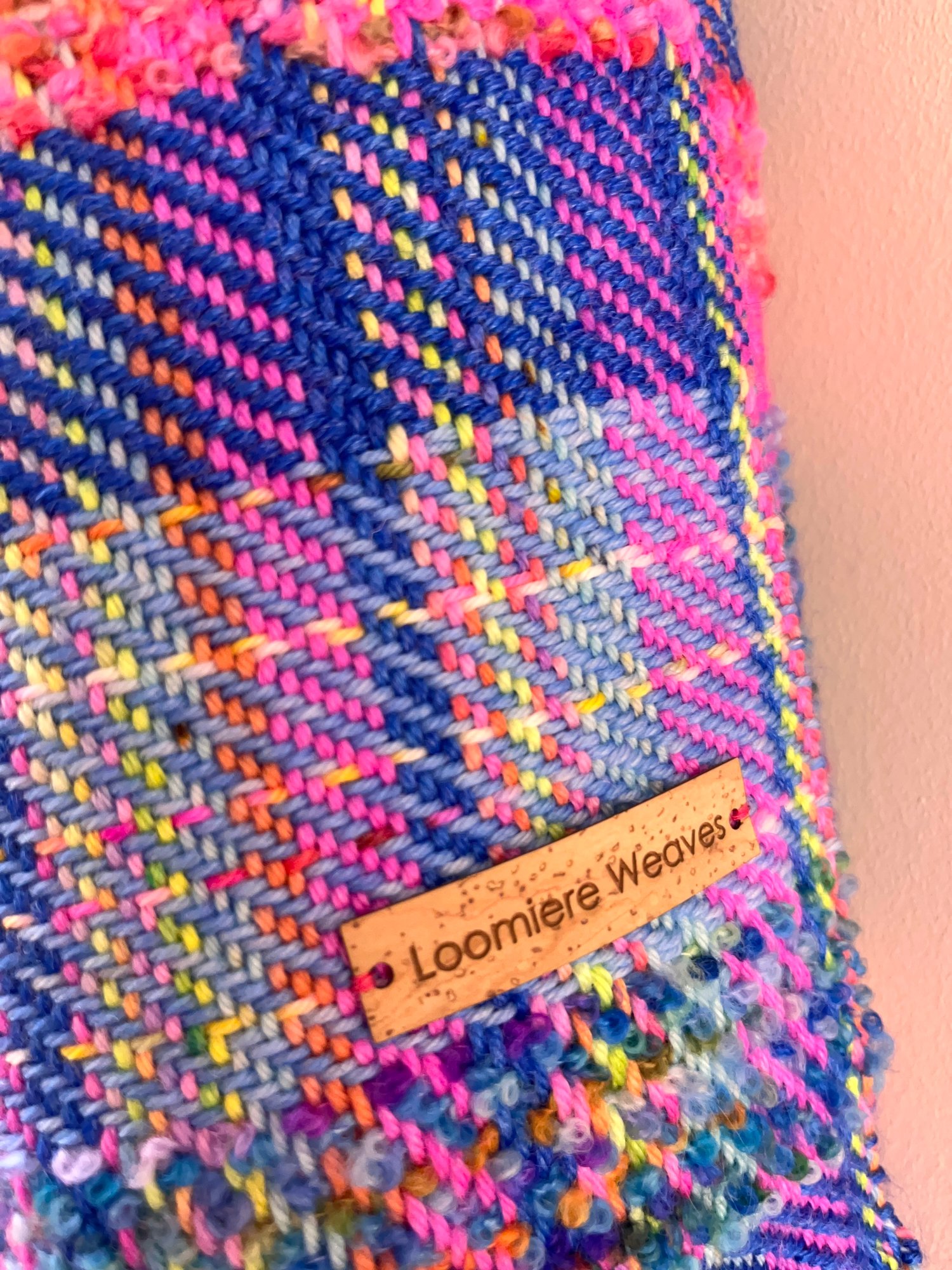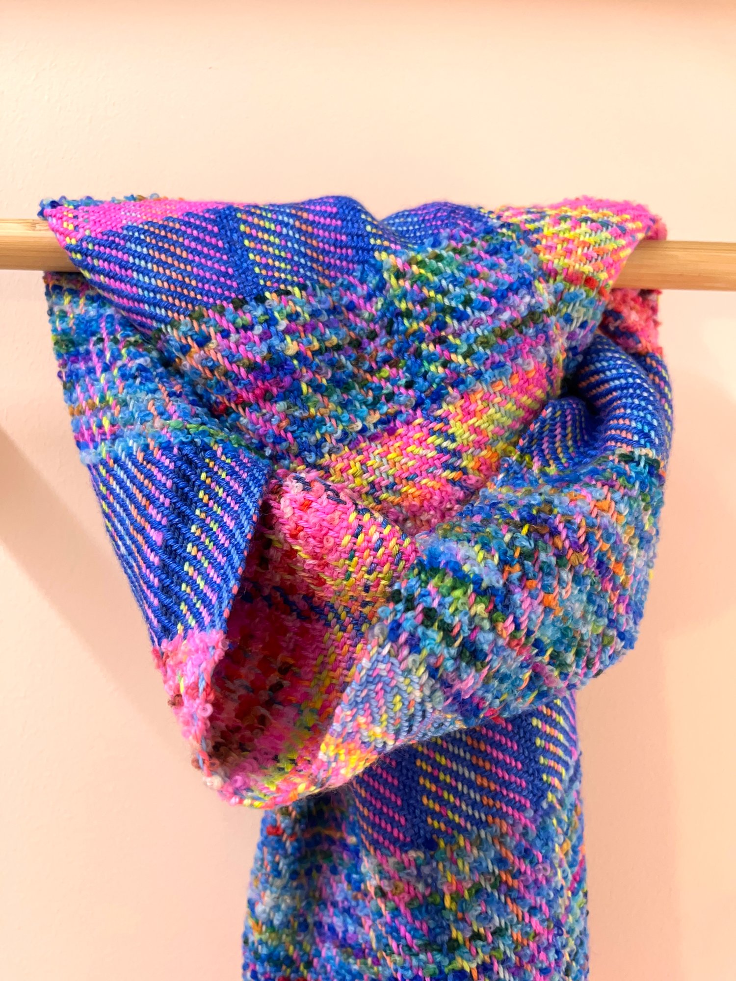 Naomi Scarf in various shades of blue with details in pinks and yellow, handwoven using luxurious merino wool.