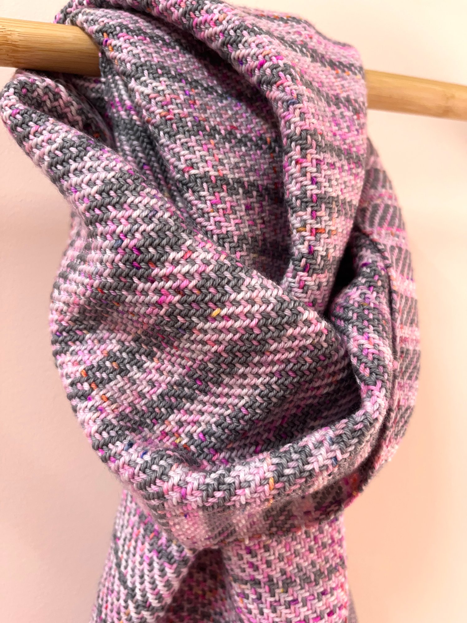Graduated Scarf in pink fleck and slate grey made with luxurious merino wool.