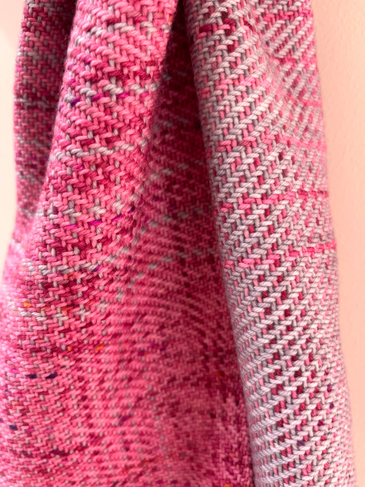 Graduated Scarf in raspberry and grey made with luxurious merino wool.